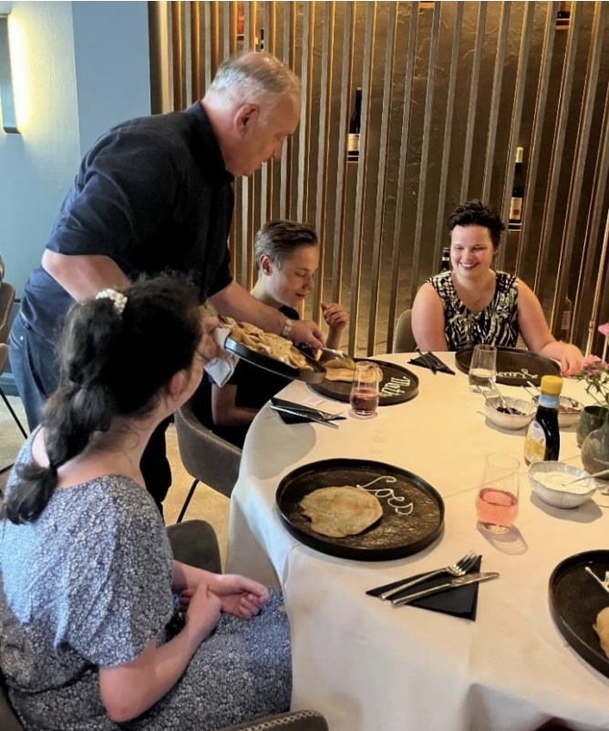 Op zaterdag 28 juni waren ze te gast in het restaurant met maar liefst 32 jongeren, verdeeld over 2 groepen. Als echte gasten werden ze ontvangen aan mooi gedekte tafels. De kok had op elk bord de naam in witte chocolade gespoten, zodat iedereen meteen naast zijn/haar vriend of vriendin kon gaan zitten. Gastvrouw Sanne schonk voor iedereen een lekker drankje in. Ondertussen bakte Rick, samen met zijn collega’s in de keuken, heerlijke pannenkoeken. De pannenkoeken werden aan tafel uitgeserveerd, waarna de jongeren er zelf jam, stroop en poedersuiker op konden doen. Wat een verwennerij en wat werd er weer gesmuld! Dhr. Raaijmakers van ACR, de sponsor die deze kavel aan MeeDoen heeft geschonken was aanwezig om mee te helpen met het uitserveren van de pannenkoeken. We bedanken hem, Rick & Sanne en Alex van de Goederen- en dienstenveiling voor het mogelijk maken van deze knallende MeeDoen seizoensafsluiting.