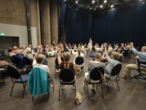 Zittend op een stoel (“op je zitbotjes” volgens Greenwood) of staand achter je stoel en met ondersteuning van muziek die ging van Glen Miller langs ABBA, Johnny Lion en Tom Jones naar Strauss en anderen kwamen vingers, handen, ellebogen, benen, voeten en ruggen in beweging. Verrast , verbaasd en soms ontroerd deed iedereen mee en zo werd er, ondanks fysieke en/of mentale beperkingen, de hele middag met het lijf gedanst!